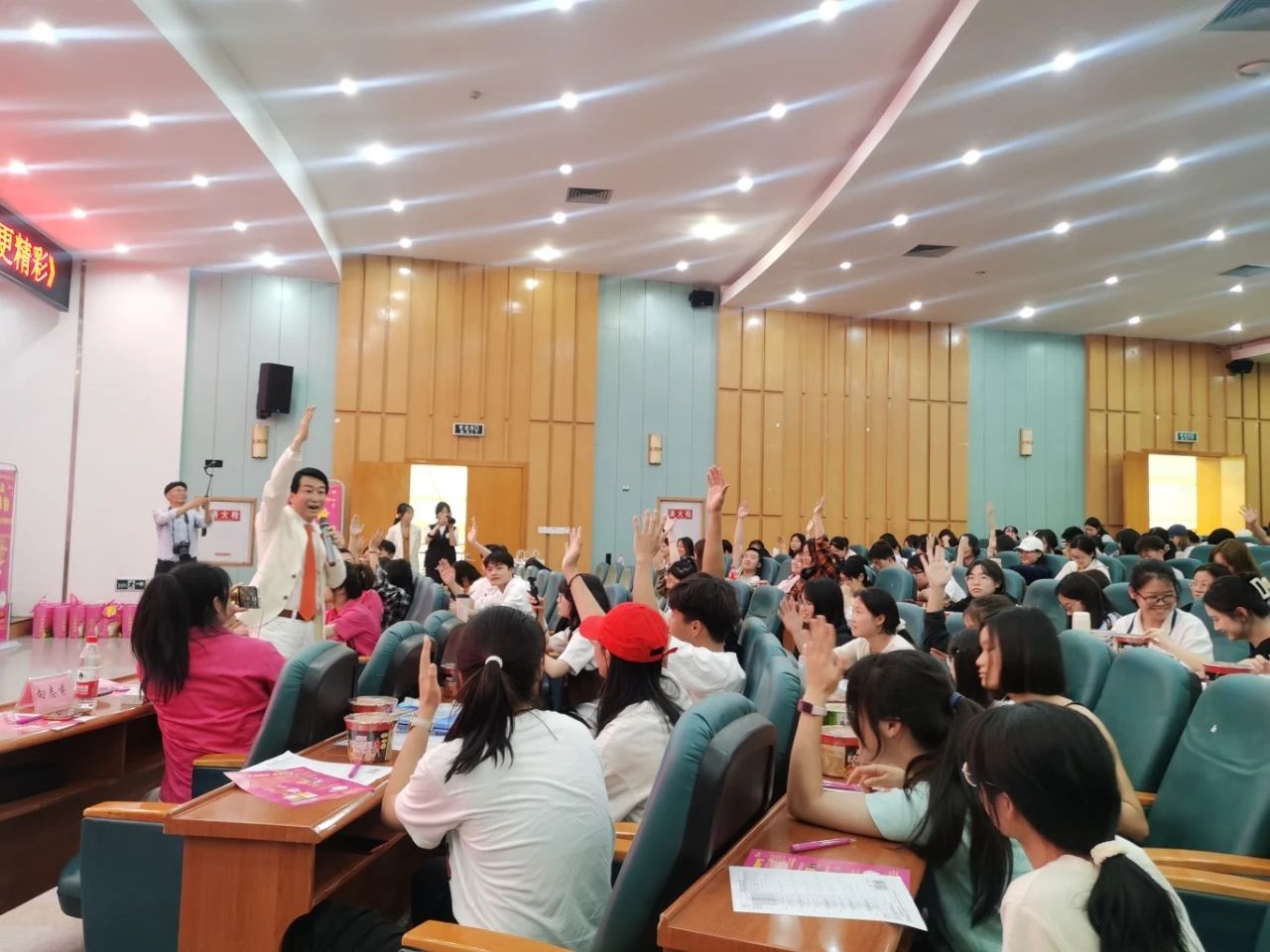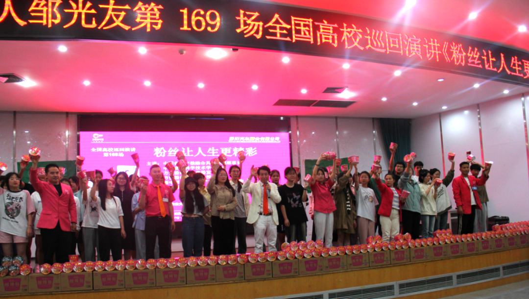隨后,又進(jìn)行了“改變從舉手開始”“與愿意創(chuàng)業(yè)的同學(xué)對話”“朗誦詩歌《粉絲心態(tài)》”“分享光友激情三寶”“共跳光友粉絲舞”“共讀意愿百分百詩”“贈送光友粉絲”等熱情互動活動,同學(xué)們的歡呼聲一浪高過一浪,現(xiàn)場氛圍逐步推向頂點。