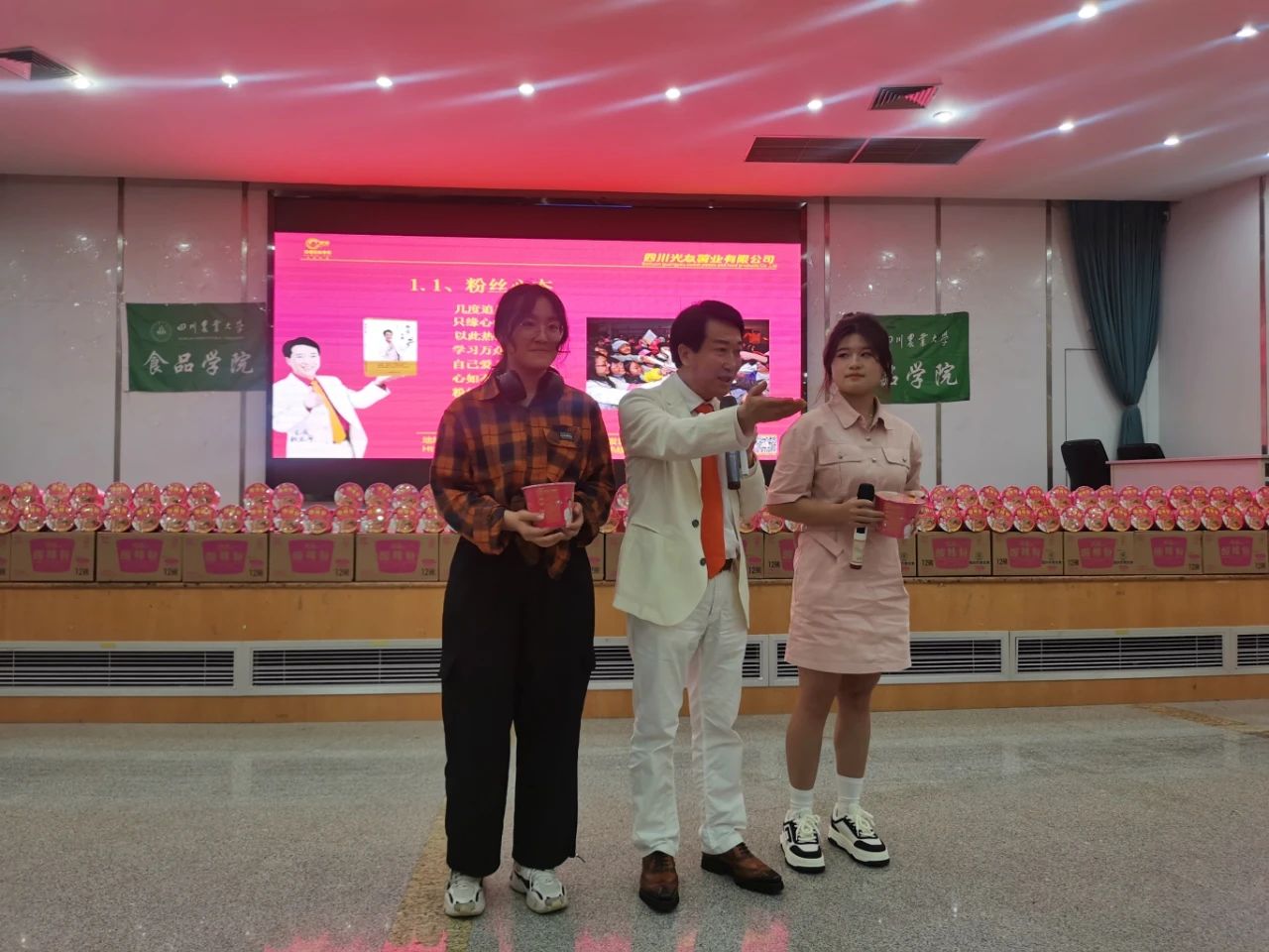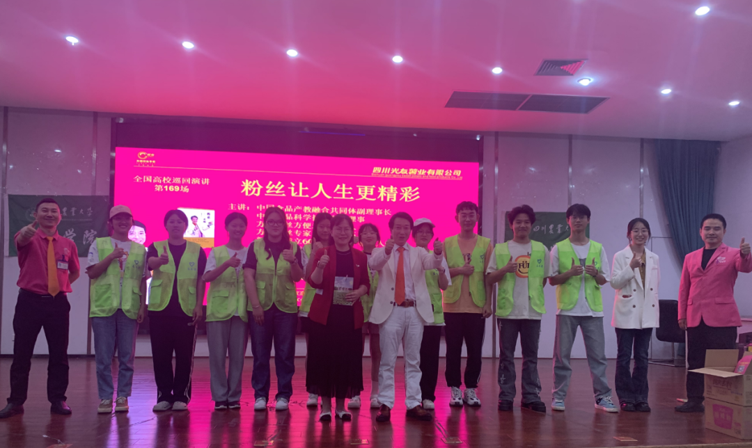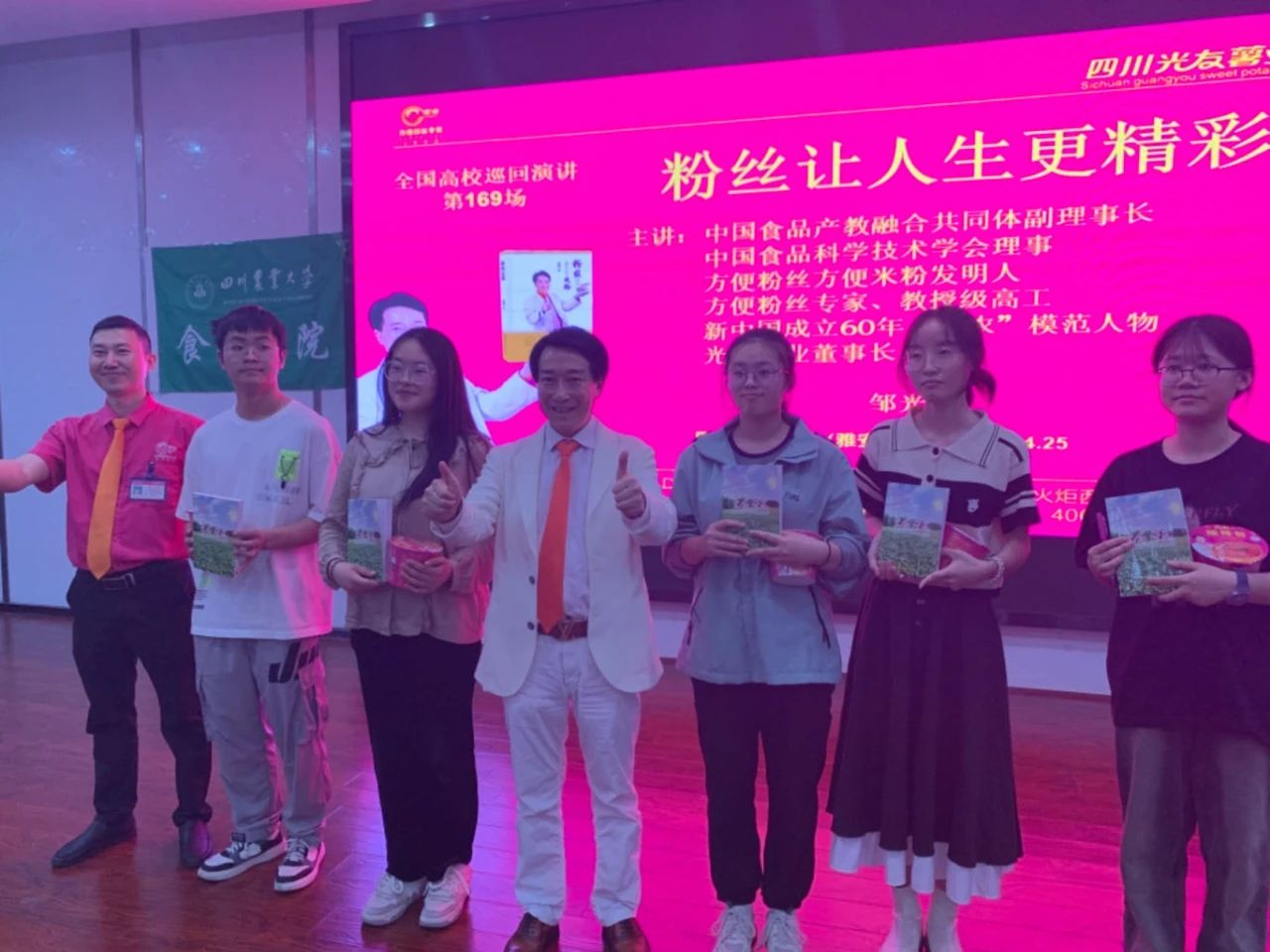 4月25日,陽光曜靈,和風(fēng)容與。正是麗日當(dāng)空時,光友薯業(yè)走進(jìn)了綠意盎然、洋溢著青春活力的四川農(nóng)業(yè)大學(xué)食品學(xué)院,開展了校企深化合作交流座談會,組織考察校區(qū)各食堂、超市,中國食品產(chǎn)教融合共同體副理事長、中國食品科學(xué)技術(shù)學(xué)會理事、方便粉絲方便米粉發(fā)明人、方便粉絲專家、教授級高工、新中國成立60年“三農(nóng)”模范人物、光友薯業(yè)創(chuàng)始人、光友薯業(yè)董事長鄒光友鄒光友成功舉行了全國高校第169場創(chuàng)業(yè)勵志演講。