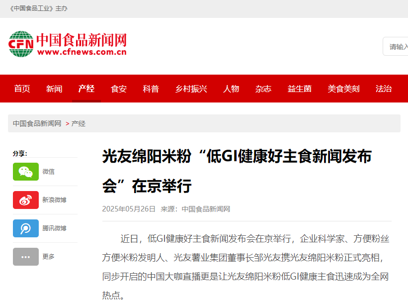 轉(zhuǎn)載中國食品新聞網(wǎng)——光友綿陽米粉“低GI健康好主食新聞發(fā)布會”在京舉行